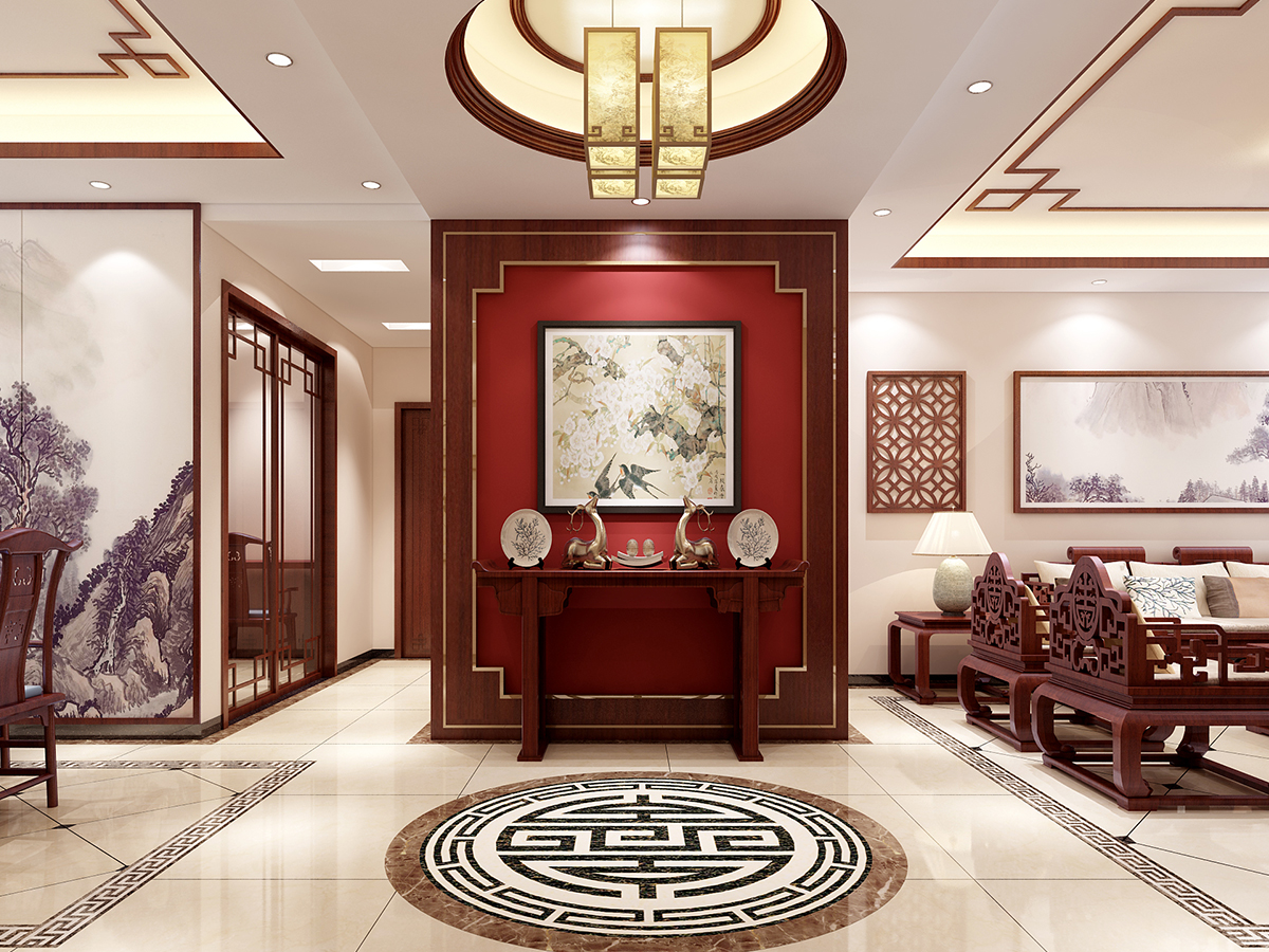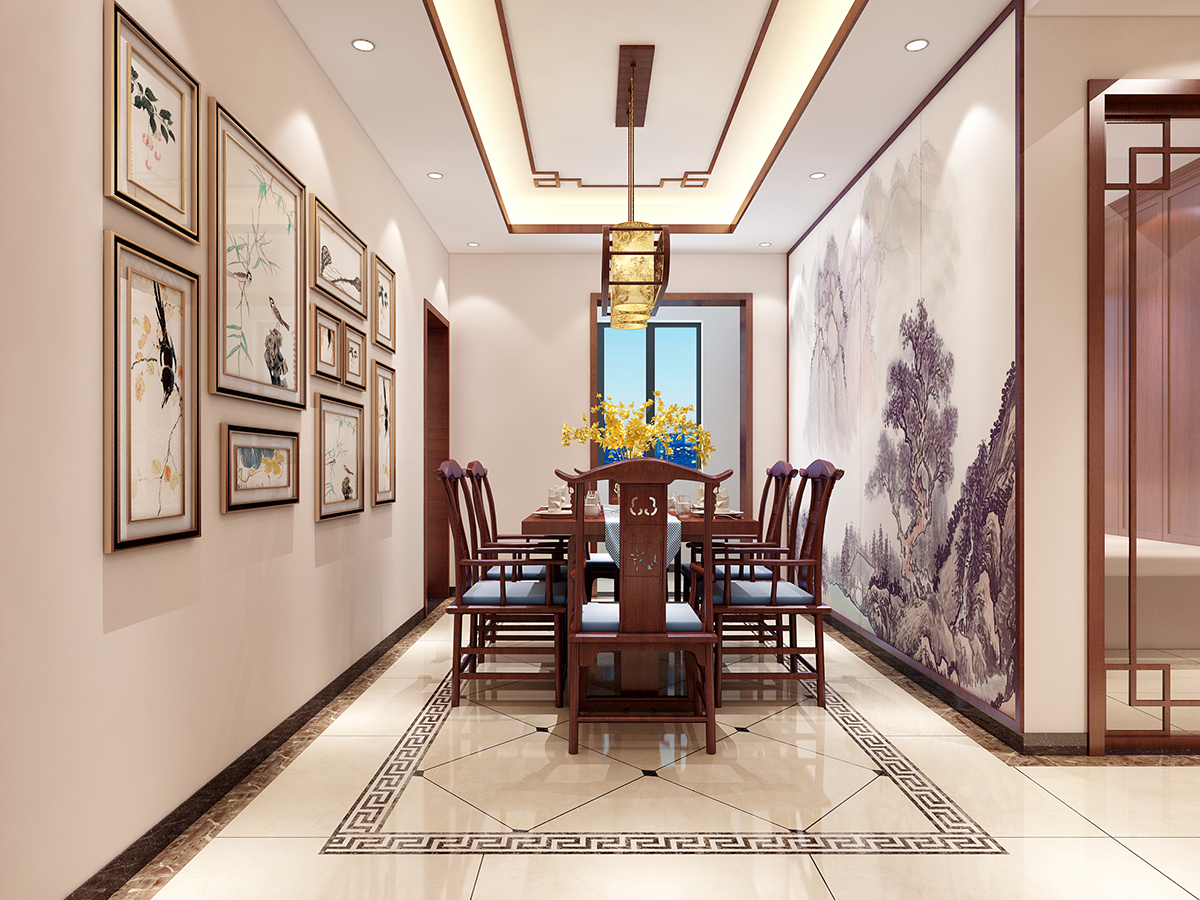 本案為中式古典,材質與顏色的選用以和諧為原則、無累贅冗余造型,溫馨的手法,保留中式風格所需要的必要的元素,在使用面積比例上推陳出新,結合配飾上力求指引居室的主人以輕松、愉快的狀態流連于居室營造的氣氛中。客餐廳十分淡雅,這里沒有多余的色彩、布置和家具,沒有喧囂與繁冗,一派寧靜悠遠;設計將原本不規則且略顯零亂的天花加以簡化整合;設計采用傳統的入戶玄關門廳把客廳與餐廳兩個空間加以適當區分,形成一個隔而不斷,分而不離的互動空間,愜意的、時尚的、成功人士的品質生活體驗盡在其中。