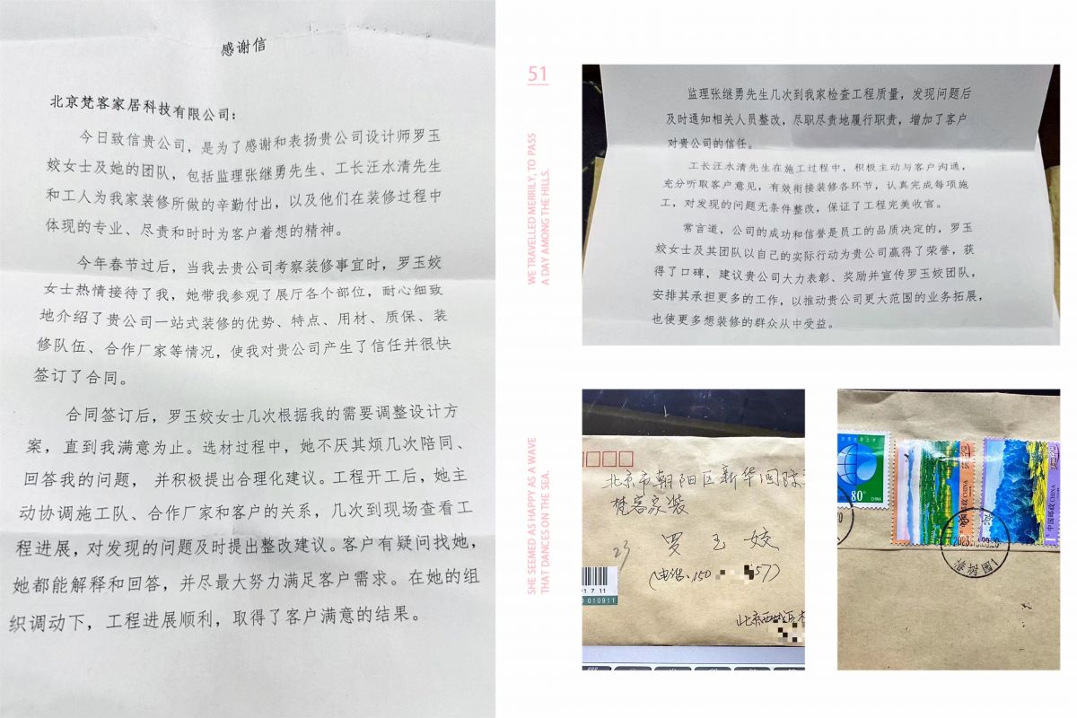 近日,梵客家裝又添喜訊,接到一封客戶郵寄來(lái)的感謝信。在這樣一個(gè)智能化快時(shí)代的社會(huì),能收到帶郵戳的信,可謂彌足珍貴。信中對(duì)梵客的設(shè)計(jì)師、監(jiān)理、工長(zhǎng)的專業(yè)化程度、工作態(tài)度及服務(wù)精神都給予高度贊揚(yáng),對(duì)工程質(zhì)量及取得的成果也表示滿意。