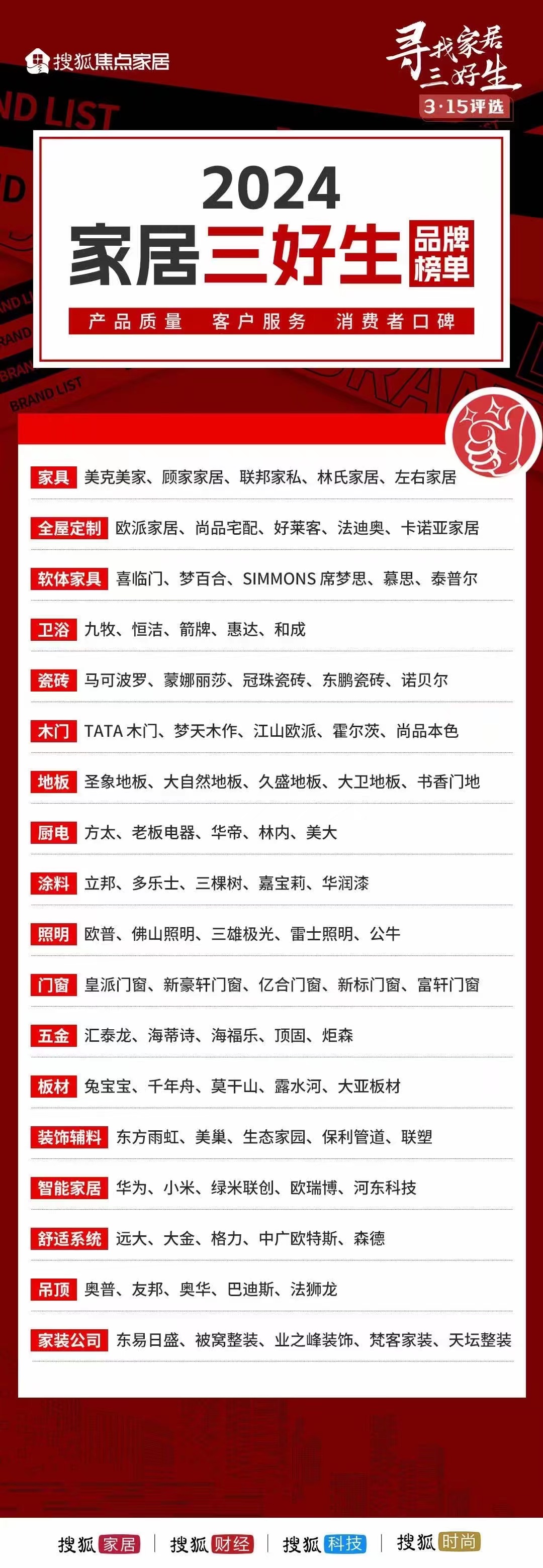 3月15日,由搜狐焦點家居主辦的“尋找2024家居三好生”評選結(jié)果揭曉。本次評選活動旨在從消費者視角出發(fā),通過問卷調(diào)查、實地走訪等多種方式,在產(chǎn)品質(zhì)量、客戶服務(wù)、消費者口碑三大維度進(jìn)行嚴(yán)格評審,權(quán)威遴選出各細(xì)分領(lǐng)域中產(chǎn)品卓越、服務(wù)優(yōu)質(zhì)、口碑良好的"三好"品牌。