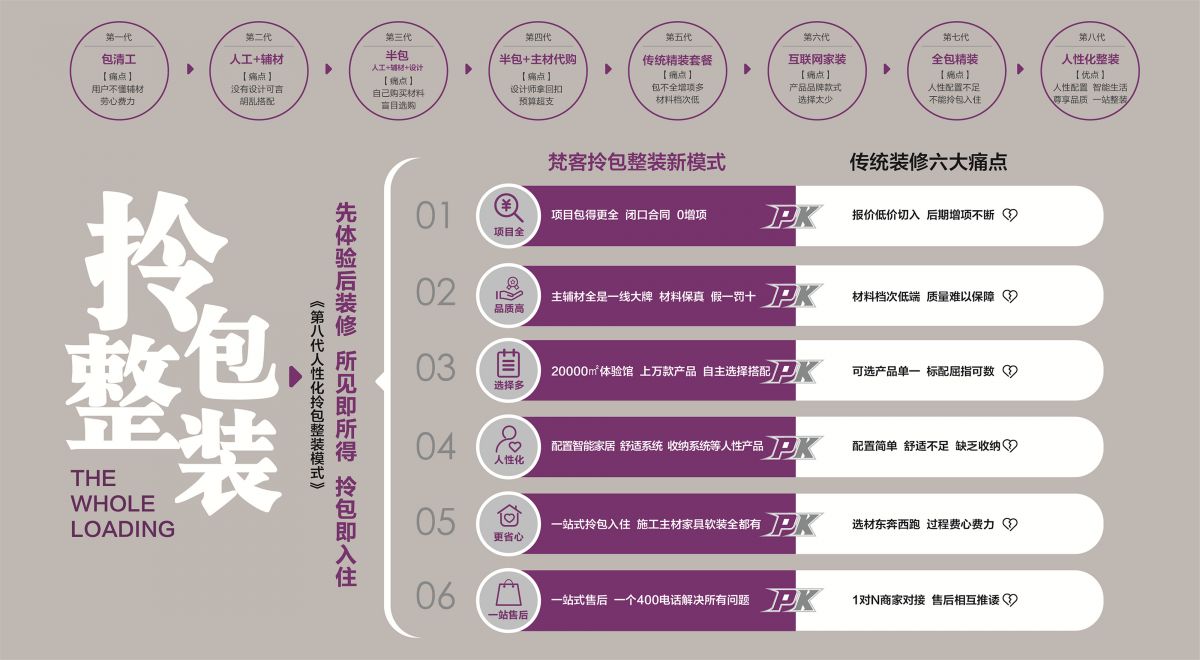 梵客家裝推出個性化拎包整裝模式以人性、智能、尊享為特色,倡導(dǎo)以人為本、智能家居、尊享品質(zhì),引領(lǐng)全包整裝新趨勢;推出高性價比的拎包整裝智尊版、輕奢版等產(chǎn)品,實現(xiàn)拎包入住。