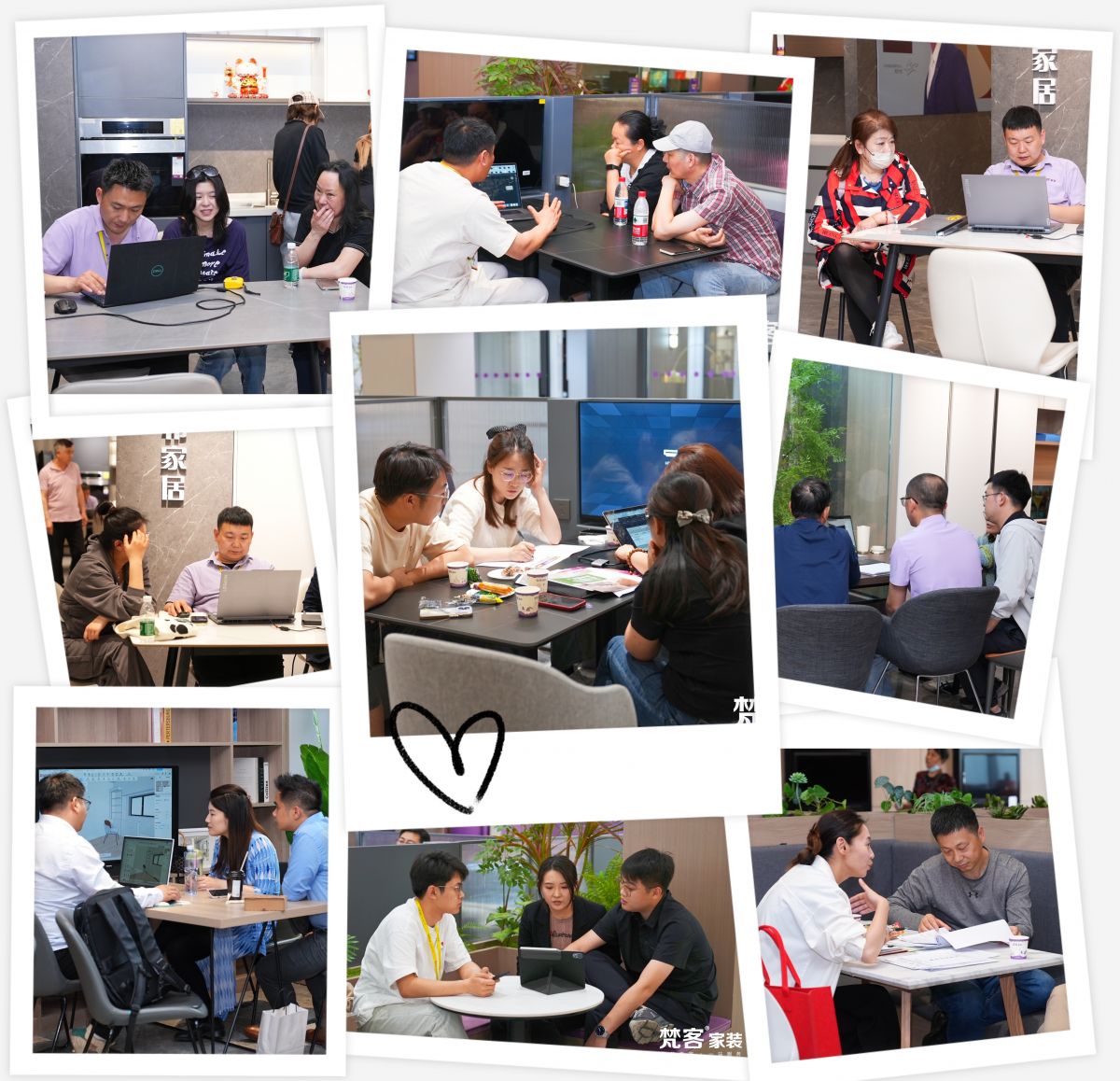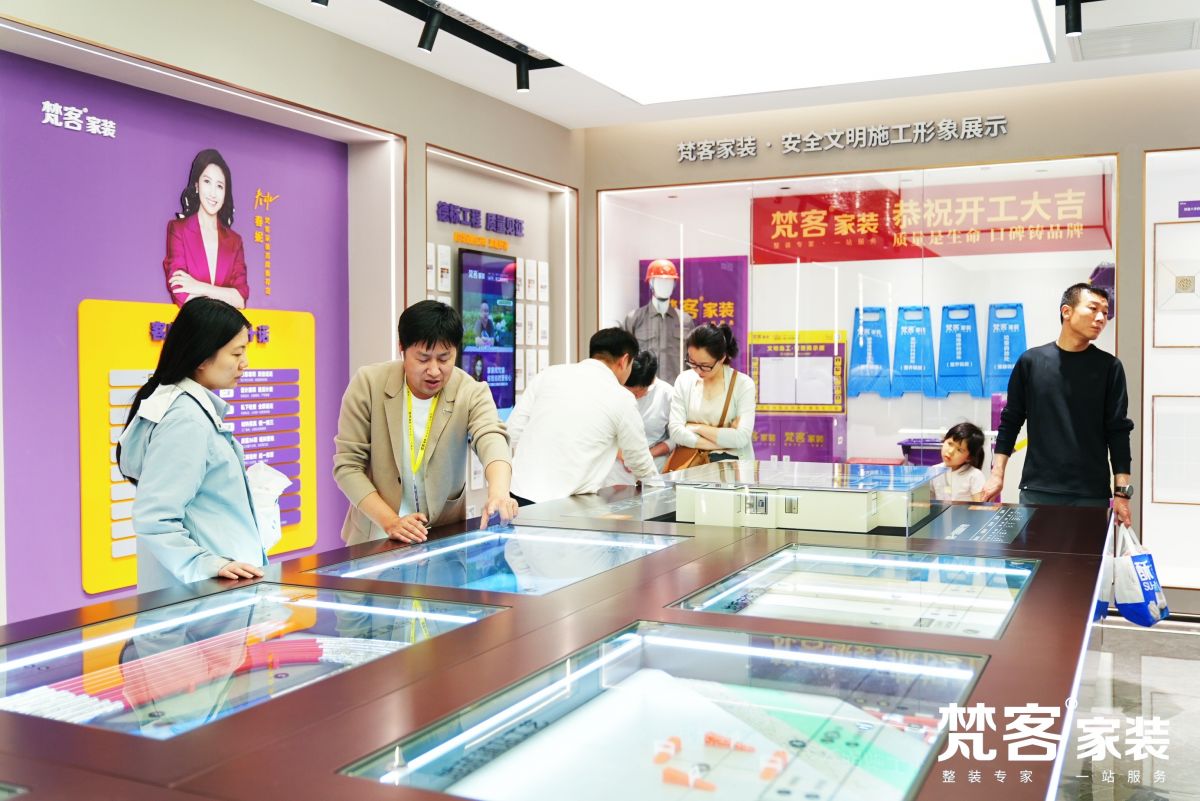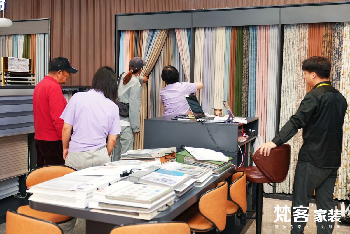在梵客家裝的洽談區,設計師正在和業主溝通方案,以便為業主提供更適合的設計方案,以及更系統化、精細化的全案服務,量身定制最舒適的居住空間。