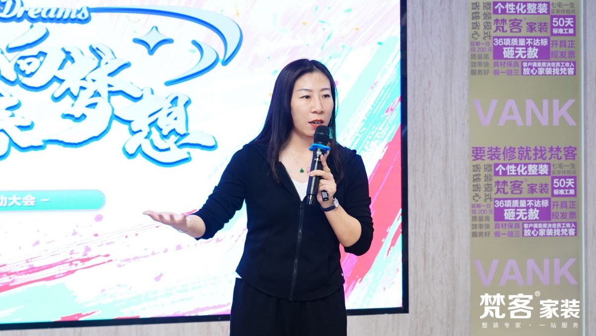 拓展結束后,梵客集團副總裁/梵客家裝總經理任琳女士宣布營銷大會正式開始。梵客家裝成立18周年,奧體中心店也馬上進入第二個年頭,這期間經歷過風雨,但最終靠大家的拼搏與堅持贏得了希望。4月,奧體中心店業績翻番,知名度越來越廣,5月更要以飽滿的熱情取得突破性成績、再創輝煌。