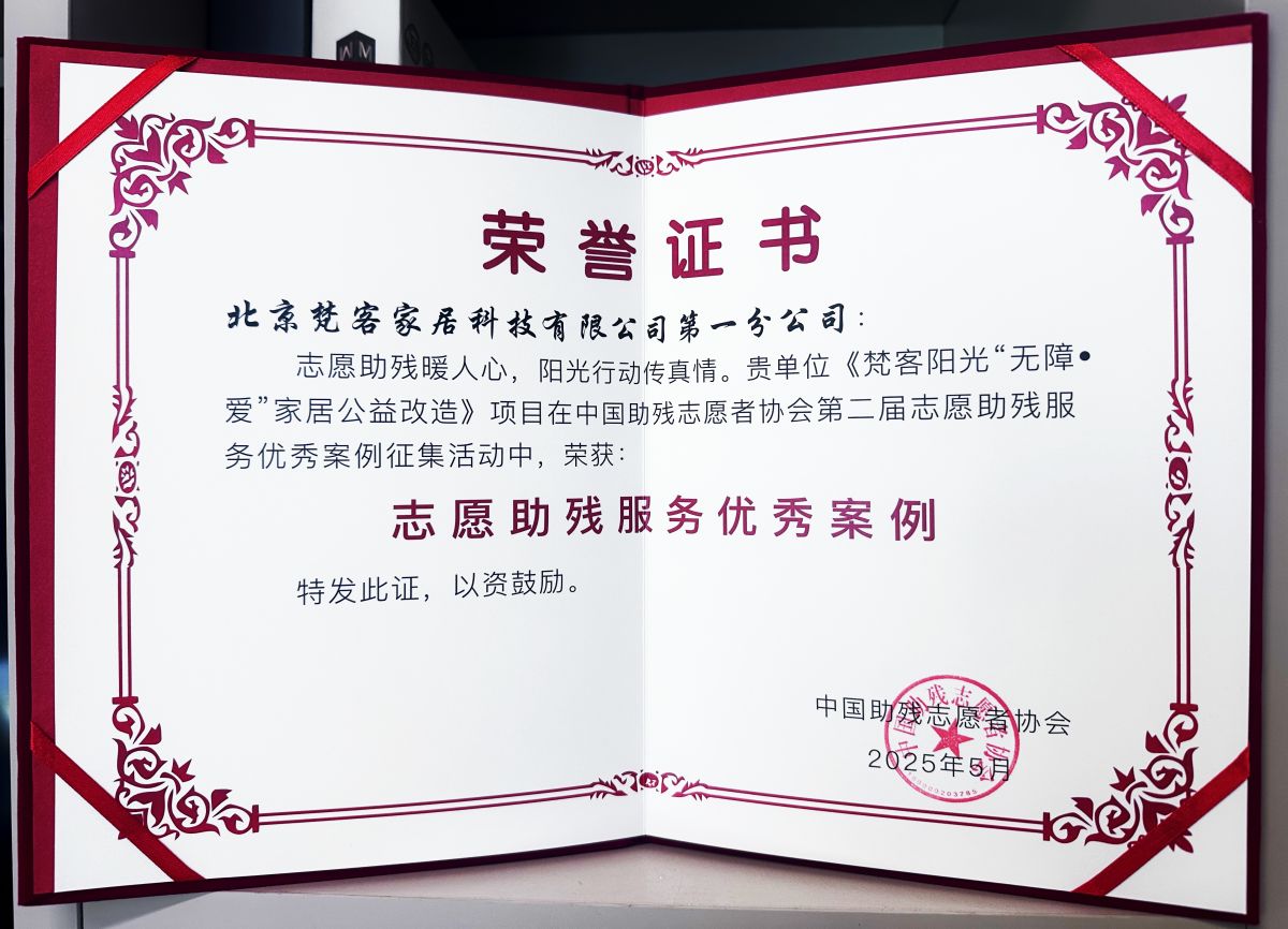 該獎是由中國助殘志愿者協會從全國24個省、市、自治區,以及社會團體、企事業單位、社會服務機構、高校、機關單位等百余份投稿中評選出的“志愿助殘服務優秀案例”!“梵客陽光“無障·愛”家居公益改造”項目也是全國范圍唯一獲此榮譽的裝企項目!