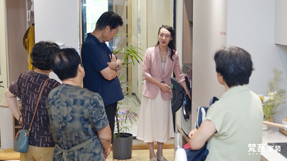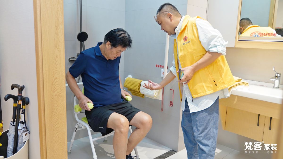 大家來到梵客家裝“無障礙適老樣板間”,在引導員的帶領下參觀體驗。樣板間以“安全、便利、舒適”為核心,打造了貼近日常生活的客廳、餐廳、臥室、衛浴等各個場景。引導員親自示范各項適老設施的使用,讓體驗者深度感受到適老化設計的價值及便捷,以及功能上的種種優勢。