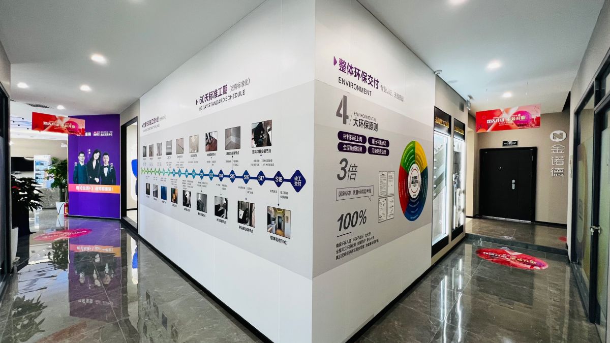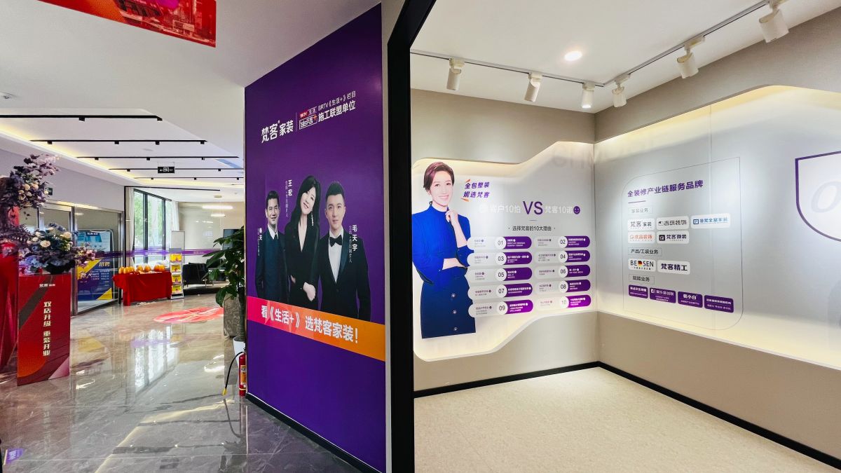 了解一個公司,從品牌開始。梵客家裝的品牌區就設置在1F,方便業主進門即可看到。品牌體系墻還清晰標明3大施工標準,4大設計標準,5大整體家裝交付體系,60天標準工期等內容,幫助業主更完善的了解施工流程。