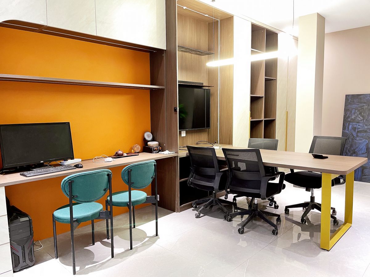 獨立洽談區及資深設計師工作室都設在1F,裝修風格迥異、各具特色。落地窗收集著充足的光線,為業主提供了方便且舒適的溝通環境。即便是夜晚,也能感受到迷人月色。