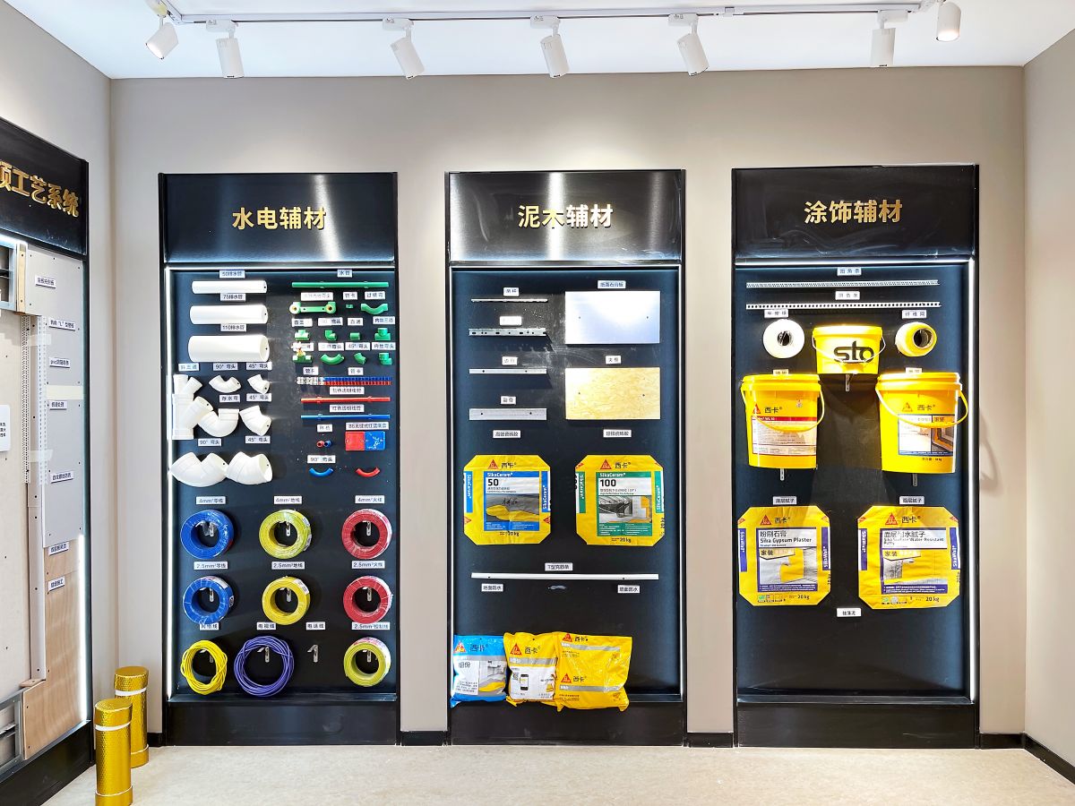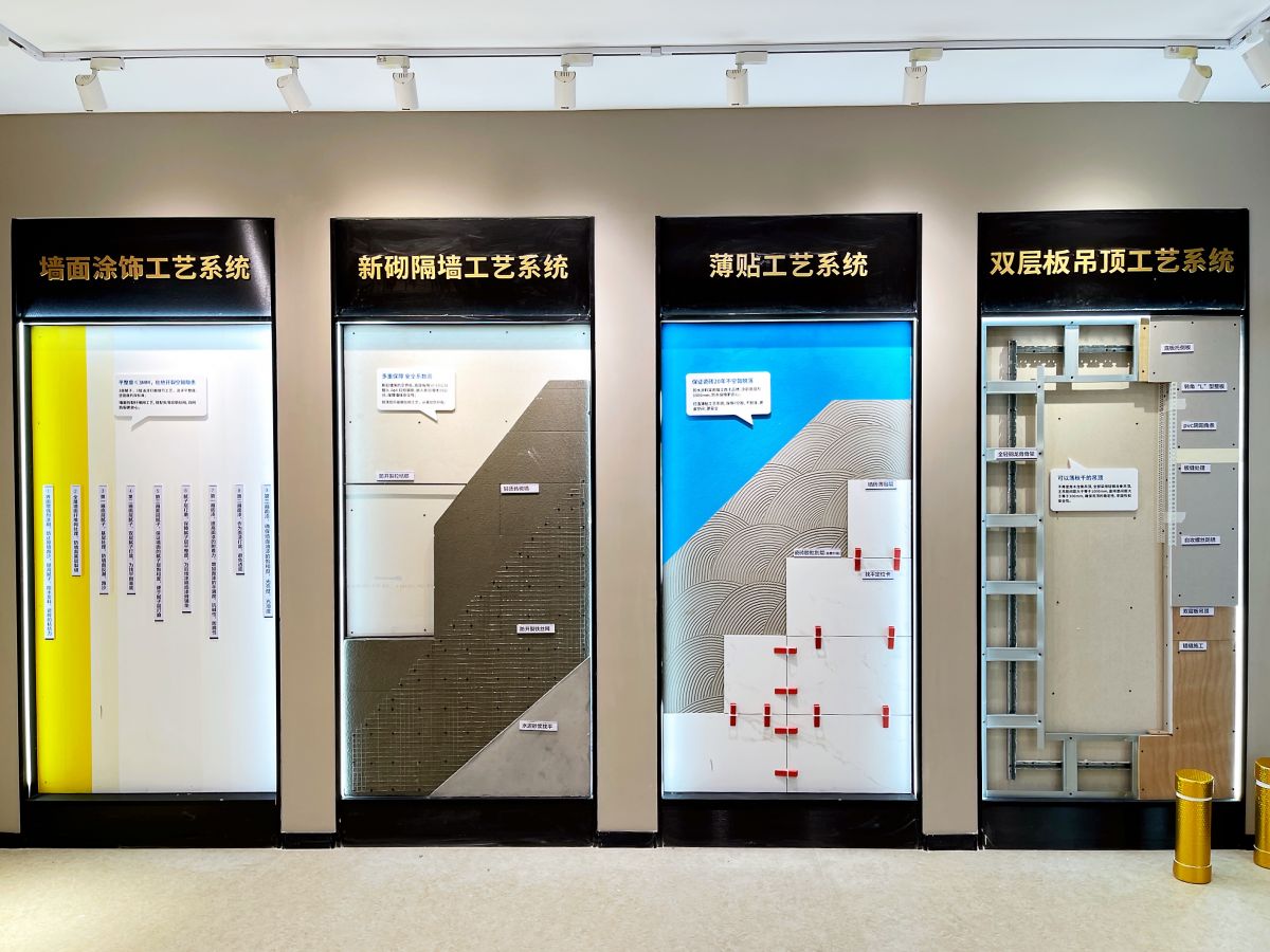 裝修工藝復雜,大家對工藝也沒有太多了解。1F專門設置了工藝區,展示并介紹了裝修中最常見到的幾種工藝,如墻面涂飾工藝、新砌隔墻工藝、薄貼工藝、雙層板吊頂工藝,以及強弱電工藝、廚衛水電工藝等,方便業主學習、理解,裝修更安心。