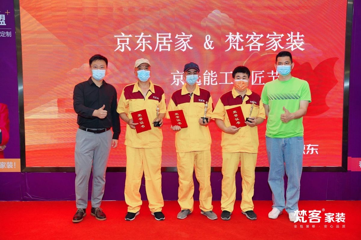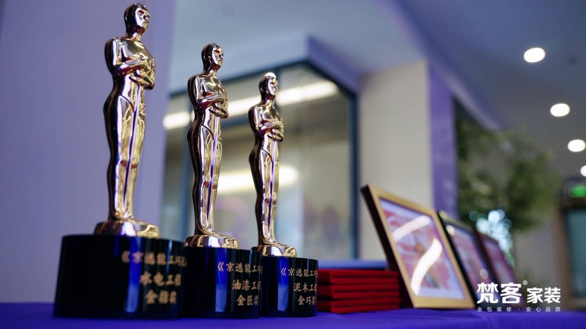 梵客家裝三位優秀的工長水電工劉五九,油工潘飛,泥木龔榮明,更是被京東居家分別評選為“京選能工巧匠水電工程金指獎”、“京選能工巧匠油漆工程金匠獎”、“京選能工巧匠泥木工程金巧獎”,并獲得獎杯和榮譽證書。