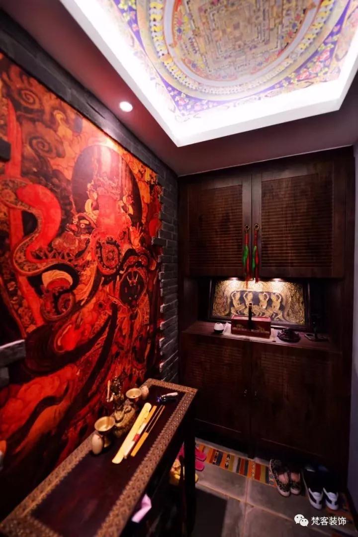 玄關做了裝飾,壁畫選用客戶自己去法海寺拍攝的廣目天王圖案;