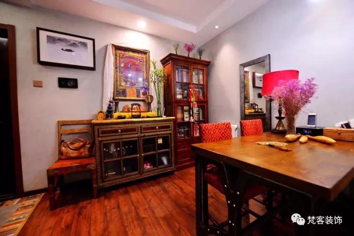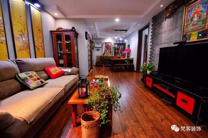 ? 電視背景墻上的唐卡是客戶多年前去西藏朋友贈送的,裝飾木質雕花是有些年頭的老舊物件,在高碑店古典家具一條街淘來的。