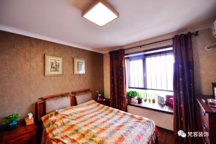 和客廳相比,臥室更顯溫馨寧謐,溫潤的色調讓這個空間充滿安寧。簡約復古的家具,防腐木飾面的飄窗,都給主人帶來家的祥和。