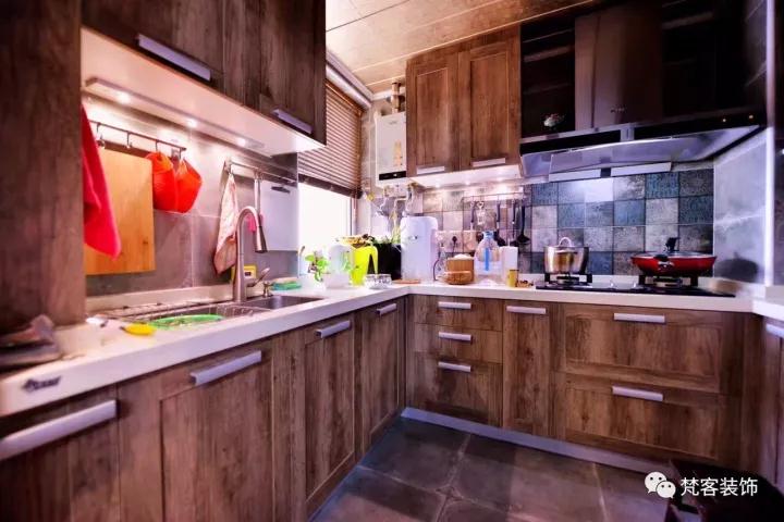 廚房具有得天獨厚的采光優勢,可以考慮用深色系打造整個空間,延續復古風格。以原木紋理的櫥柜搭配灰色墻磚、甲骨文花片,整個空間就是現代與古典的交融。