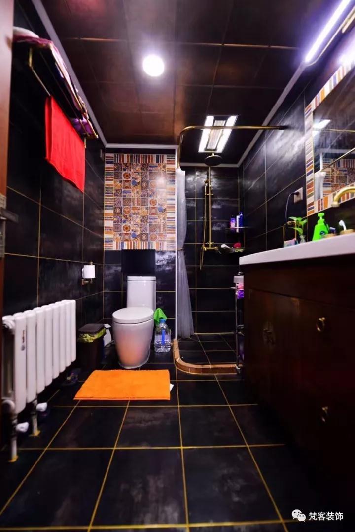 因為墻地磚是深色的金屬磚,所以在采光上做了不同的光源設計,除了三合一的暖風帶有照明作用外,還增加了頂部筒燈和鏡前燈,方便使用。