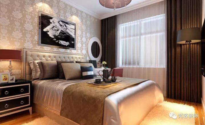 主臥延續了客廳低調奢華的風格,窗簾依舊采用深咖啡色,床頭靠枕及床品分層次運用深淺咖啡色,床面也采用真絲的光滑面料,在質感上和客廳形成統一整體,低調奢華有韻味。