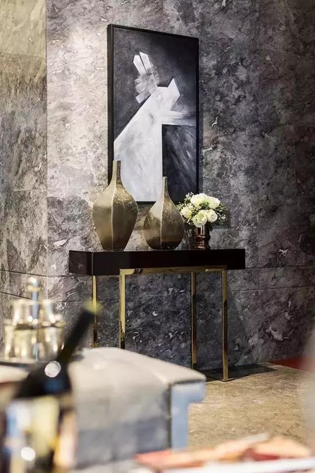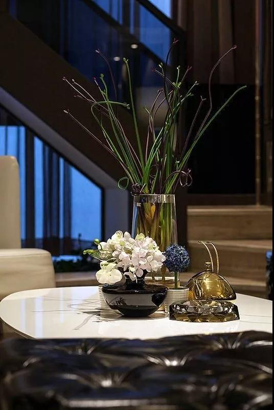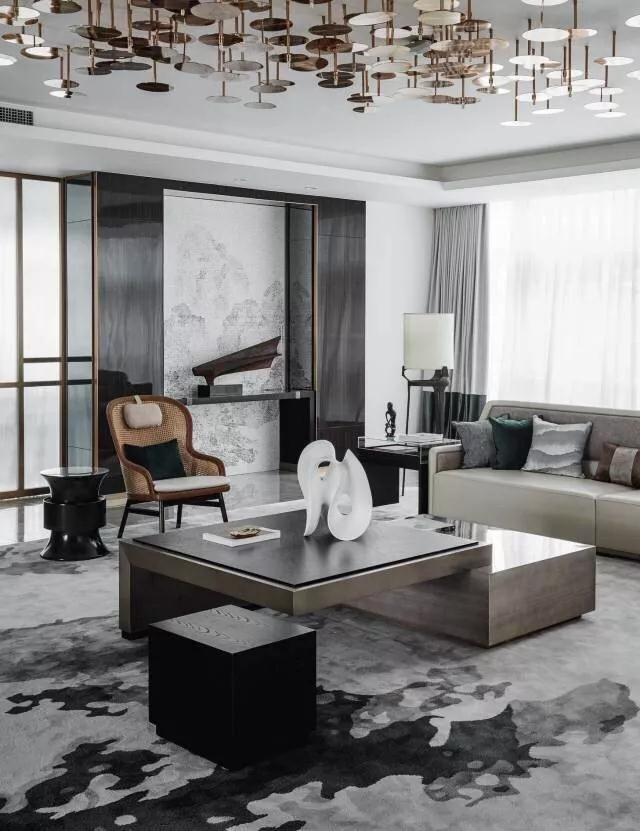 本案主要基調是黑灰咖色等高級灰的顏色,本身就很低調奢華,以灰色為主色調,黑色小面積點綴,咖啡色做一個暖色的調節,空間不單調沉悶,同時增加了暖色系,不那么冷。光面絲綢類布藝沙發更有感覺,搭配粗質地毯,材質上的對比更豐富了空間的層次感。
