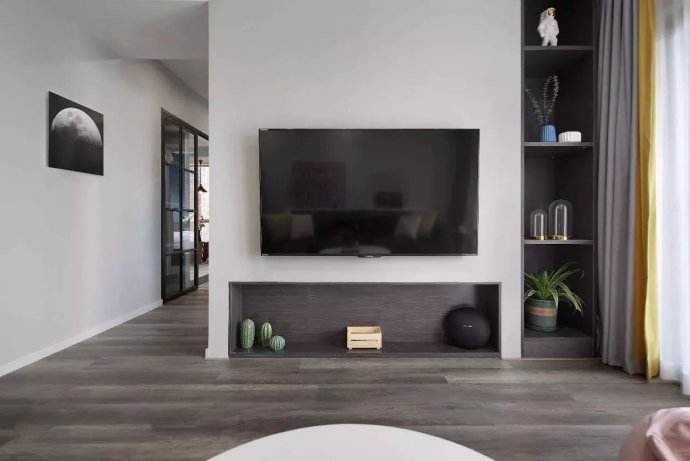 我為什么會糾結(jié)電視柜的問題呢,因?yàn)槔掀糯笕艘呀?jīng)否定了我的投影,所以我也不會去弄音響以及其他設(shè)備了,就單單一個(gè)電視機(jī)。現(xiàn)在的電視機(jī)都自帶安卓系統(tǒng),也不需要機(jī)頂盒,那我弄個(gè)電視柜的話還能放什么?如果不需要的話,我只要像題圖這樣,直接掛個(gè)電視機(jī)就完事兒了。