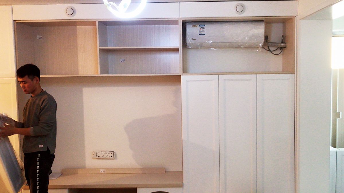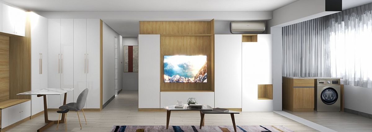 ↑ 客廳,收納柜與電視背景墻結合,將儲物做到極致。抽屜以及不同大小的柜子,方便各類物品的存放。嵌入式空調的設計,更整體統一 ,提升空間整潔度。