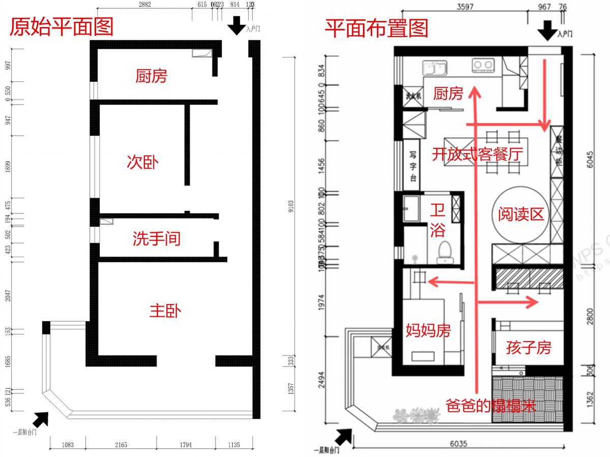 改造前,原房型以每個(gè)小空間為單位。改造后,呈現(xiàn)出客廳+餐廳+閱讀區(qū)一體化大格局,空間更通透明亮,通風(fēng)透氣性更佳,滿足業(yè)主全家人一起互動(dòng)的心愿。