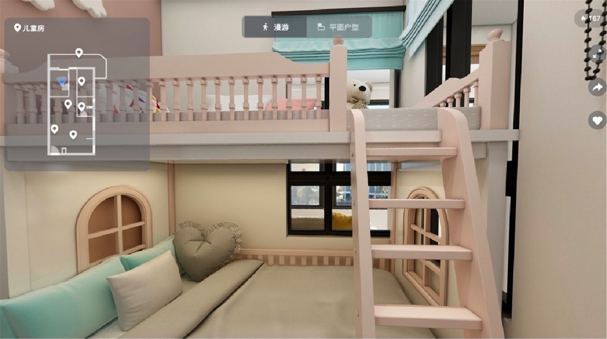 和媽媽房正對的是小朋友的房間,這兩個(gè)區(qū)域都由原來的主臥改成。因?yàn)槭请p胞胎女兒,所以特別設(shè)計(jì)了上下鋪,保證兩個(gè)孩子獨(dú)立的睡眠空間,彼此互不影響。