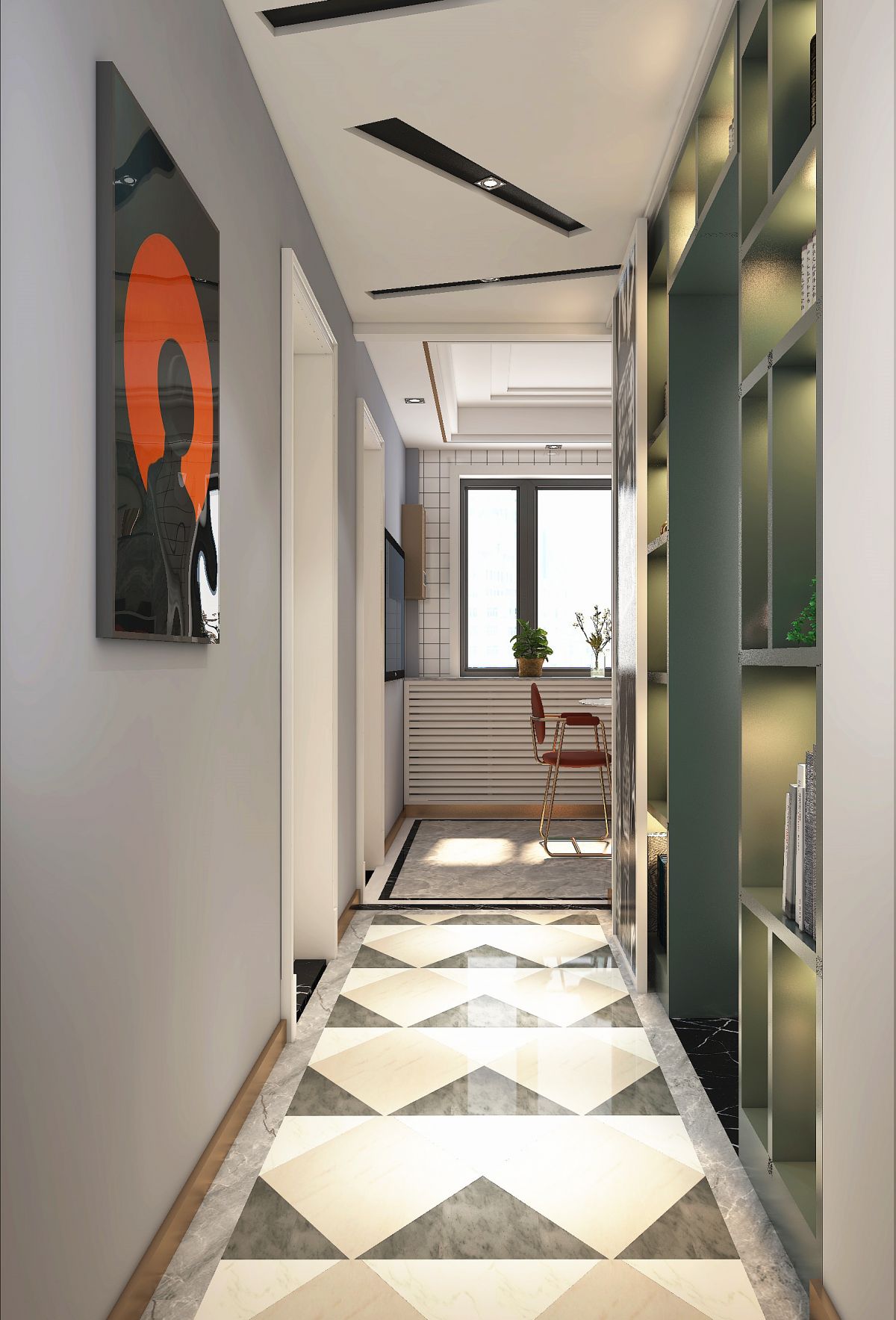 廊廳采光不佳,書柜內設燈光照明,不僅讓這個小區域光彩奪目,也方便平日拿取書籍。幾何圖形的地磚時尚又閃亮,現代輕奢風若影若現,反射出的光源也為空間增加了一絲亮度。