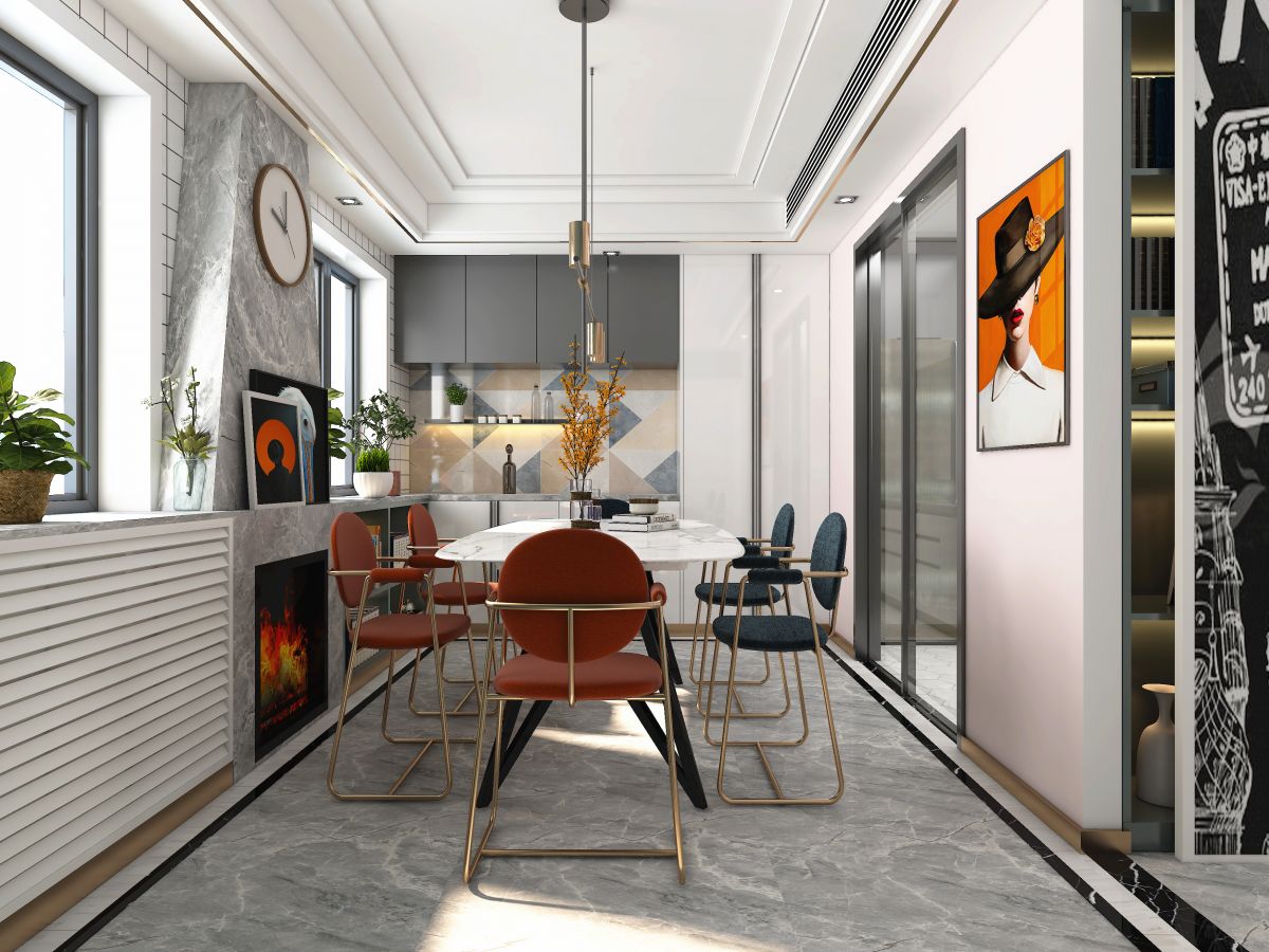 石材被廣泛運用在整個空間,由地板蔓延至墻面,營造出高貴、大方的氛圍。為了美化暖氣管道,專門設計了一個裝飾壁爐,大理石裝飾,成為餐廳一景。