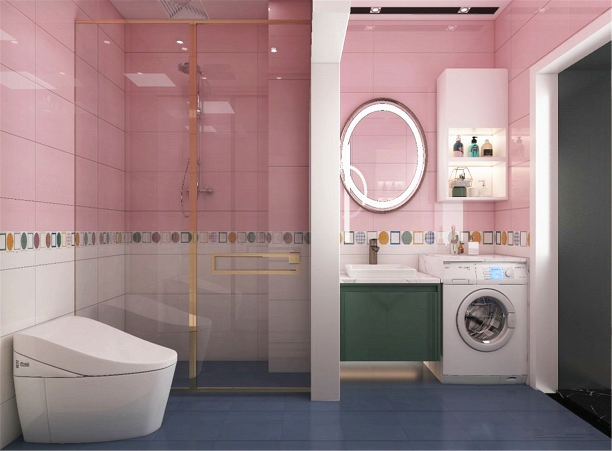 作為私密空間,業主希望浴室的設計能大膽一些。充滿浪漫氣息的櫻花粉成為主打色,五彩腰線俏皮絢麗,裝點著整個空間,帶來輕松愉悅的視覺體驗。